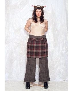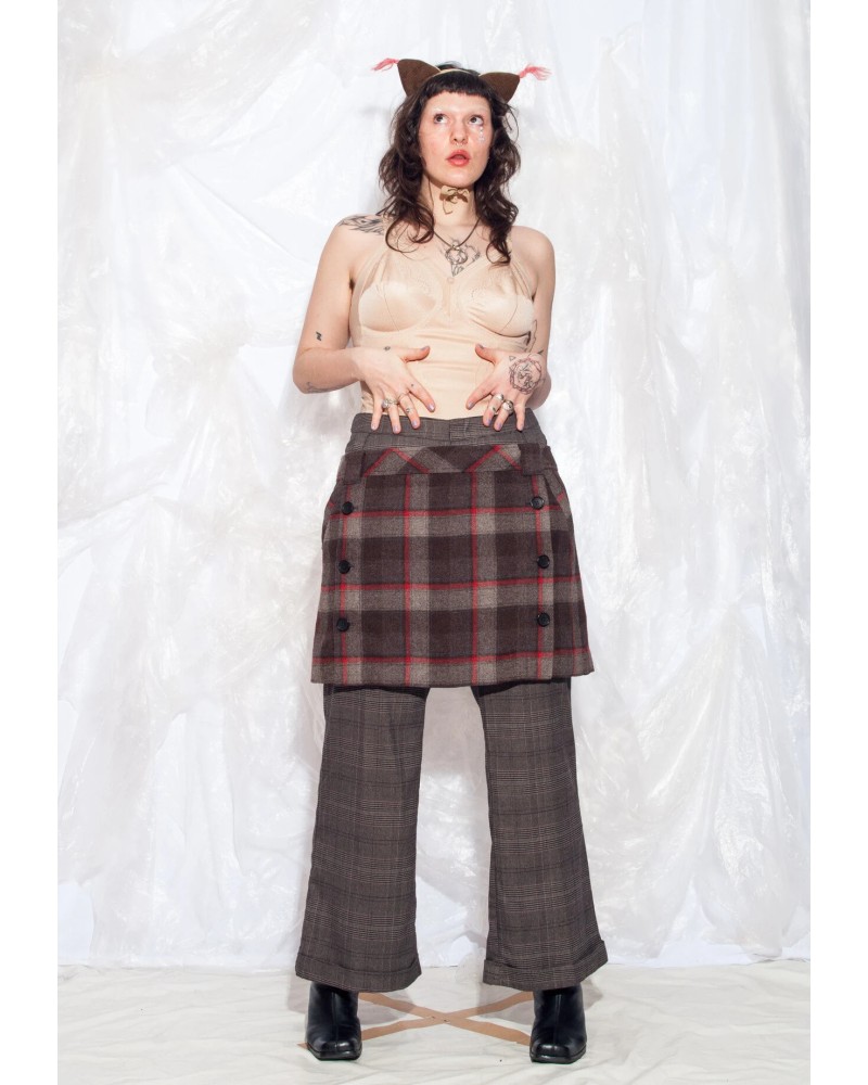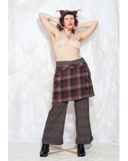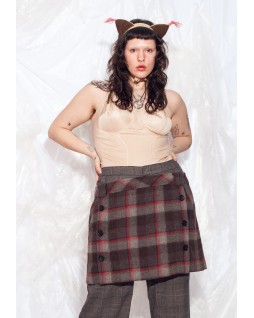 This kilt-inspired mini skirt features a tailored front panel in a striking check pattern. Buttons cinch the sides for a sleek, streamlined look. Pair it easily with leggings, leggings, or even trousers for a runway-ready look.