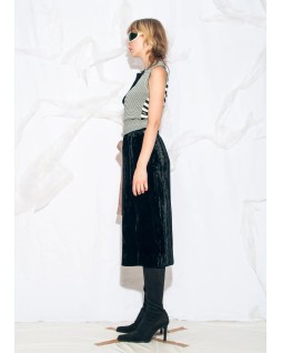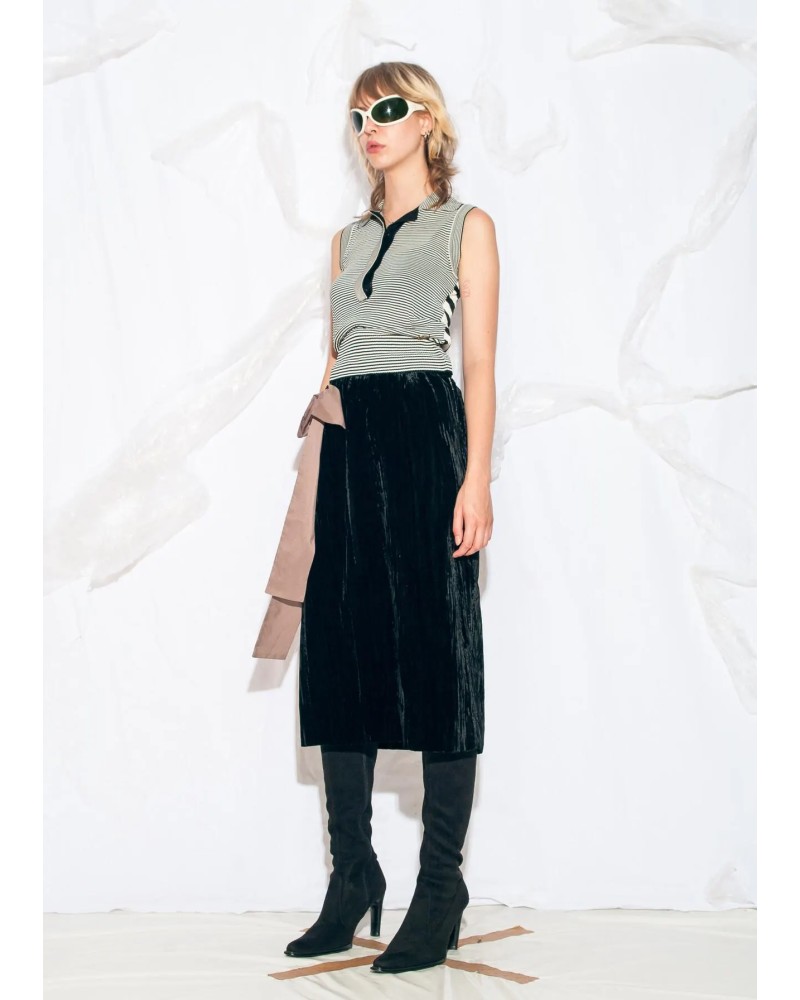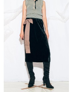 This elegant wrap midi skirt is crafted from soft, lustrous velvet and detailed with a contrast belt at the waist. The slim, straight line enhances refinement, while the side ties add a soft, sculptural feel—easily transforming the look from a dinner date to an afternoon at the gallery.