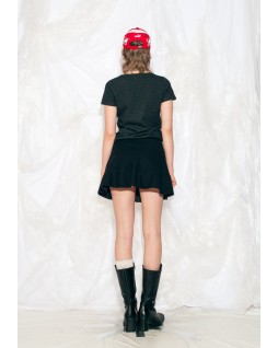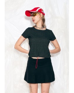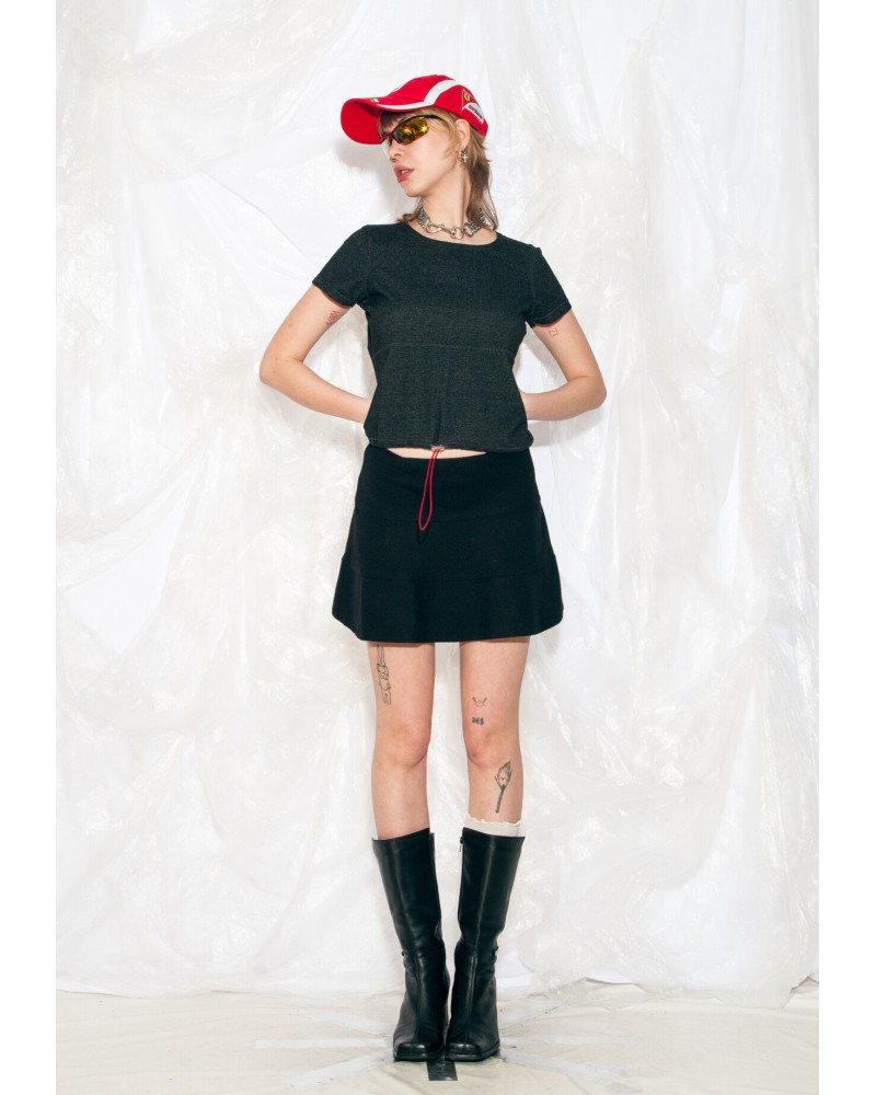 This simple black miniskirt has a slightly sporty feel. The smooth top paneling keeps the hips flowing, while the ruffled hem gathers the skirt for ease of movement. A touch of red at the zipper adds a stylish, sporty touch.