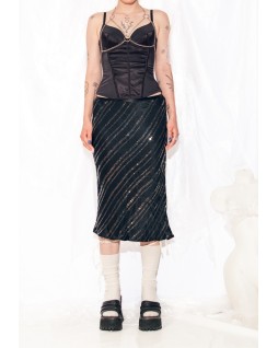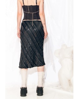 A must-have for nightclubs, this chic midi skirt exudes understated drama. Trimmed with diagonal sequin stripes, it features a straight silhouette that hugs the hips and cascades smoothly to mid-calf, creating a shimmer with every step.