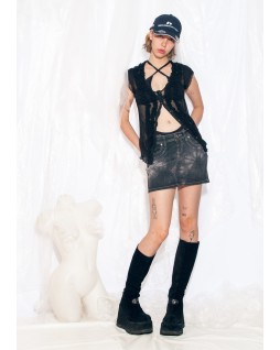 This washed black denim miniskirt exudes grunge cool. The compact cut and high-contrast topstitching define the hips, while the marbled ombré design creates a distressed, rock-ready look.