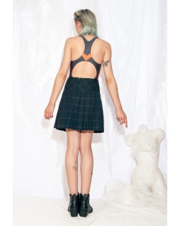 Inspired by the Scottish kilt, this miniskirt features a sculpted yoke and sharp knife pleats. The dark check adds a touch of classic elegance, while the double-buttoned sides add a modern, streetwear edge—easily styled with a T-shirt, sneakers, a sweater, and boots.