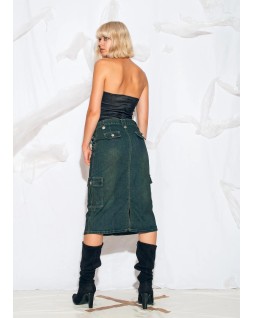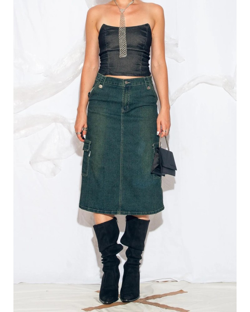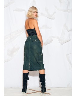 Workwear meets urban elegance. This dark olive green denim straight-leg midi skirt features a clean front, center seam, and flap cargo pockets. The structured design creates a clean silhouette perfect for everyday wear.