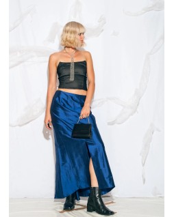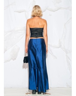 This high-shine satin piece in a rich cobalt blue is cut to fit snugly at the hip and gently flare at the hem. The clean front and leg-revealing side slits add an elegant, effortless touch to an evening look.